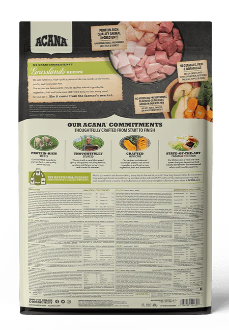 When it comes to ACANA™ recipes, we’re obsessed with choosing ingredients that are nutritious, delicious and protein-rich. Our Highest Protein Dog Food is perfect for satisfying your dog with even more of the animal protein they crave. Our Grasslands recipe is crafted with 70% quality animal ingredients1 like farm-raised lamb, duck, and eggs balanced with 30%2 fruit and vegetables to help nurture your dog with flavour and animal protein. It also includes prebiotics and fibre to help support your dog’s digestive health. And with no artificial colours, flavours or preservatives added in our kitchen, it’s a recipe you and your dog will both love. Nurture your dog with a protein-rich, nutritious, and delicious dog food to help them live a healthy, happy life.