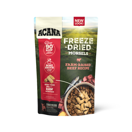 ACANA™ Freeze-Dried Food gives your dog all the benefits of raw nutrition, with none of the mess! Available in bite sized morsels or breakable patties, our high-protein Beef Recipe satisfies your dog’s natural cravings in a convenient, freeze-dried form. It’s made from 90% quality animal ingredients* including beef, organs, and bone, and balanced with wholesome vegetables and fruit. It’s also infused with hearty and delicious bone broth for a taste dogs love. Satisfy your dog’s cravings with the nutritious animal ingredients in ACANA Freeze-Dried Food!