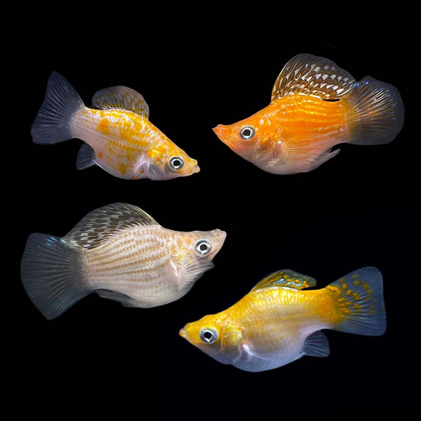 These hardy and easy-to-care-for fish will live for up to 5 years if cared for properly. Mollies prefer to be kept in groups of 3 or more. Males generally reach 3.5 inches in length, while females generally grow to 4 inches in length from nose to tail. These fish require tropical water temperatures from the low-to-high 70’s. Because of their size and high activity level, we recommend a small group of 3 mollies be kept in no less than 15 gallons of water. They do best in water that is alkaline, but are able to adapt to different pH levels if acclimated to them.