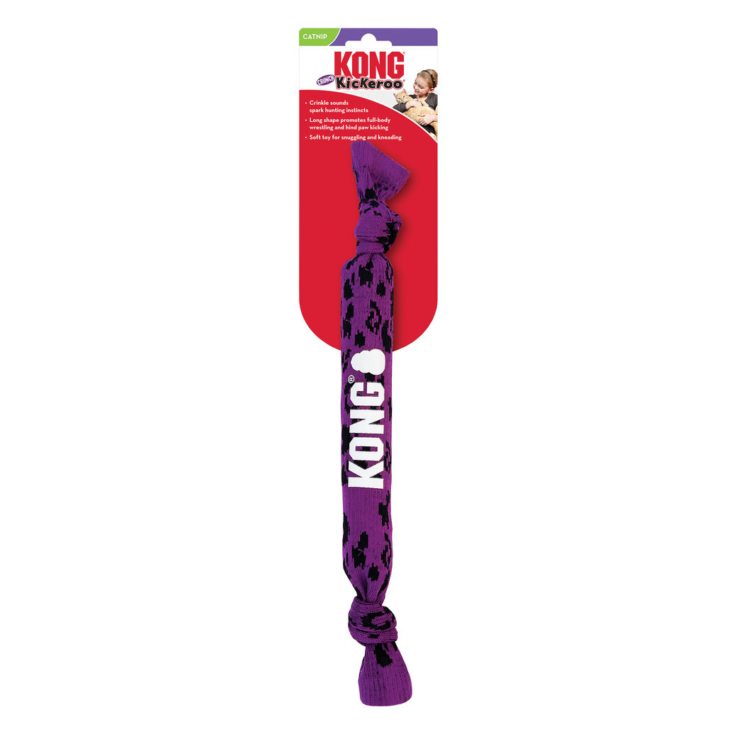 KONG Kickeroo Crunch crinkles as cats play, sparking natural hunting instincts. The extra-long body invites the healthy, full-body wrestling and hind paw kicking that cats just can’t get enough of. KONG Premium North American Catnip inside boosts mood and prolongs play with a soft toy that’s ideal for kneading and snuggling, too.