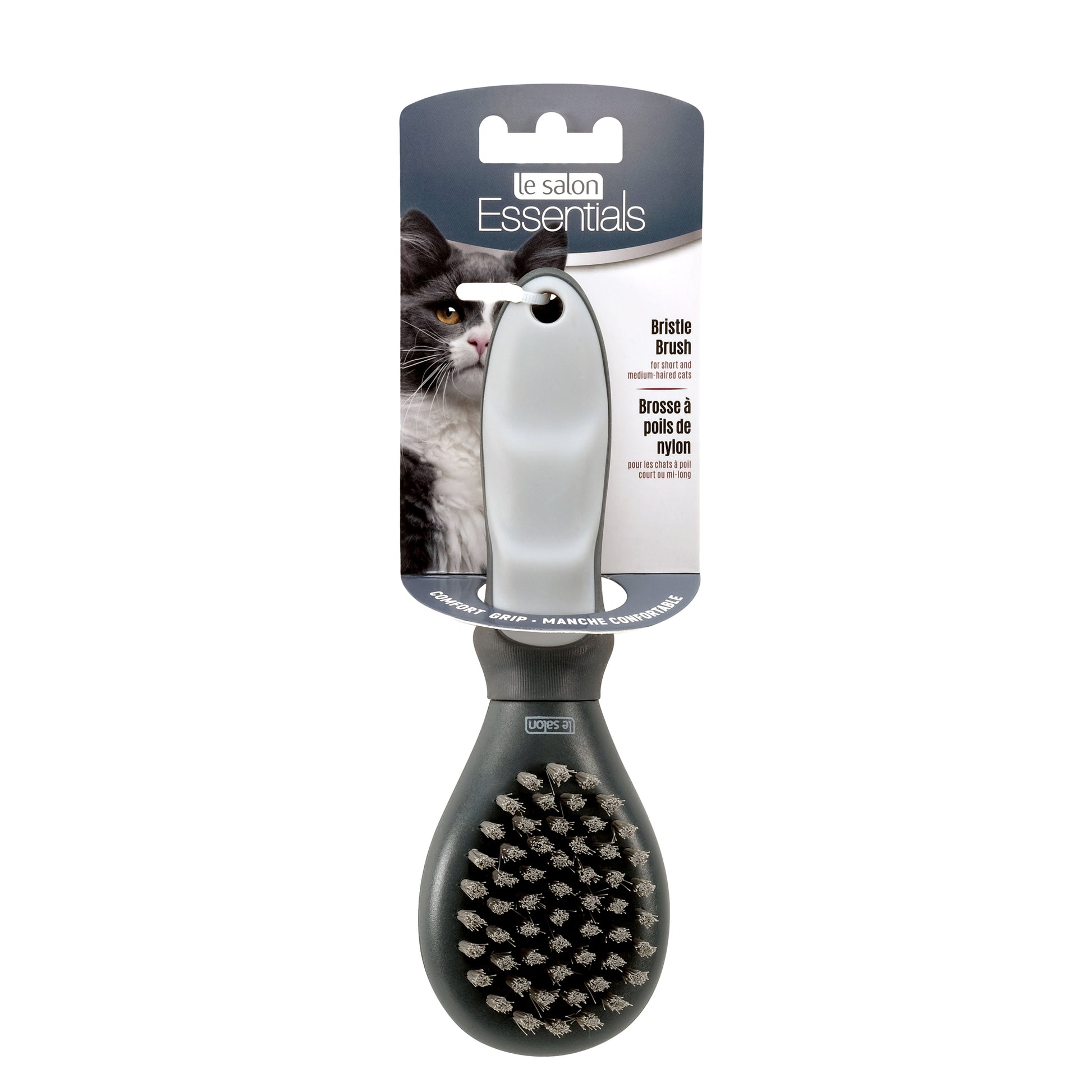 Le Salon Essentials Cat Bristle Brush, Small. Gray nylon bristles, gray pad, charcoal handle. Nylon bristles help remove dead hair and debris. Recommended for the general grooming of most short, medium and long-haired breeds.