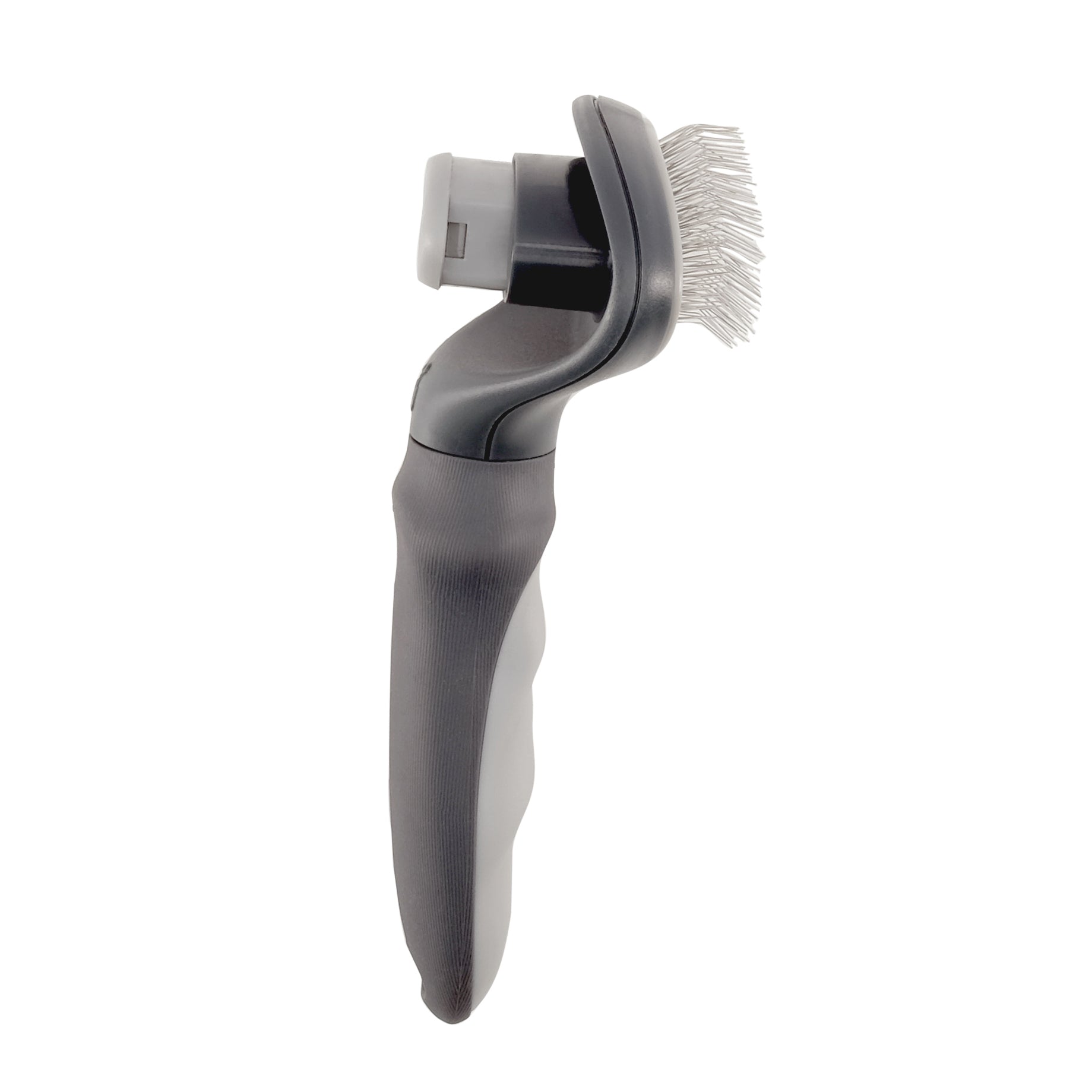 The Le Salon Self-Cleaning Slicker Brush removes dead hair and prevents matting. The revolutionary mechanism releases hair in one easy step. Brush against the coat growth to loosen dead hair and skin, then in the direction of the growth to remove debris and polish the coat. Suitable for the general grooming of most breeds.