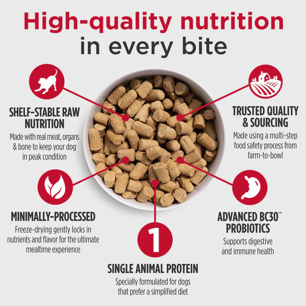 Give them whole prey nutrition in an easy-to-serve form. Our Freeze-Dried Raw recipes contain meat, organs and bone combined with functional ingredients like fruits and vegetables to provide 100% complete & balanced nutrition for puppies, adults, and seniors. Plus, our Freeze-Dried Raw line is the first freeze-dried pet food to include BC30, which helps with digestive support and gut health. Feed as a full meal or sprinkle on top of their kibble for pure, raw enjoyment.