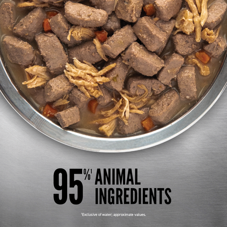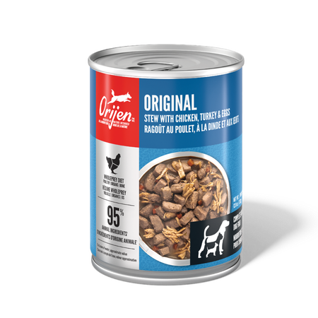 ORIJEN® Original Stew is a nourishing wet food featuring rich inclusions of chicken and turkey shreds to help your dog thrive. Packed with 95%* premium animal ingredients, ORIJEN Original Stew contains fresh or raw animal ingredients like chicken and turkey. This includes succulent WholePrey ingredients like organs and bone to add a source of essential vitamins, nutrients and amino acids. Feed your dog ORIJEN Premium Wet Dog Food alone to add moisture and nourishment to their diet, or add it on top of their favourite ORIJEN kibble for a nutritious addition at mealtime.