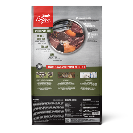 A biologically appropriate, high-protein dry dog food recipe. It features 85% quality animal ingredients, including lamb, venison, duck, and fish, along with organs and bone. The recipe is designed to mimic a dog's natural diet and is suitable for all breeds and life stages.