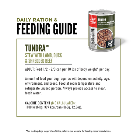 ORIJEN™ Premium Wet Dog Food is a nourishing wet food with rich inclusions of meat shreds that will help your dog thrive. Packed with 95%* premium animal ingredients, Tundra Stew includes fresh or raw animal ingredients like lamb, beef and duck. This includes succulent WholePrey ingredients like organs and bone that add a source of essential vitamins, minerals and amino acids. Feed your dog ORIJEN Premium Wet Dog Food alone to add moisture and nourishment to their diet, or add it on top of their favourite ORIJEN kibble for a nutritious addition at mealtime.